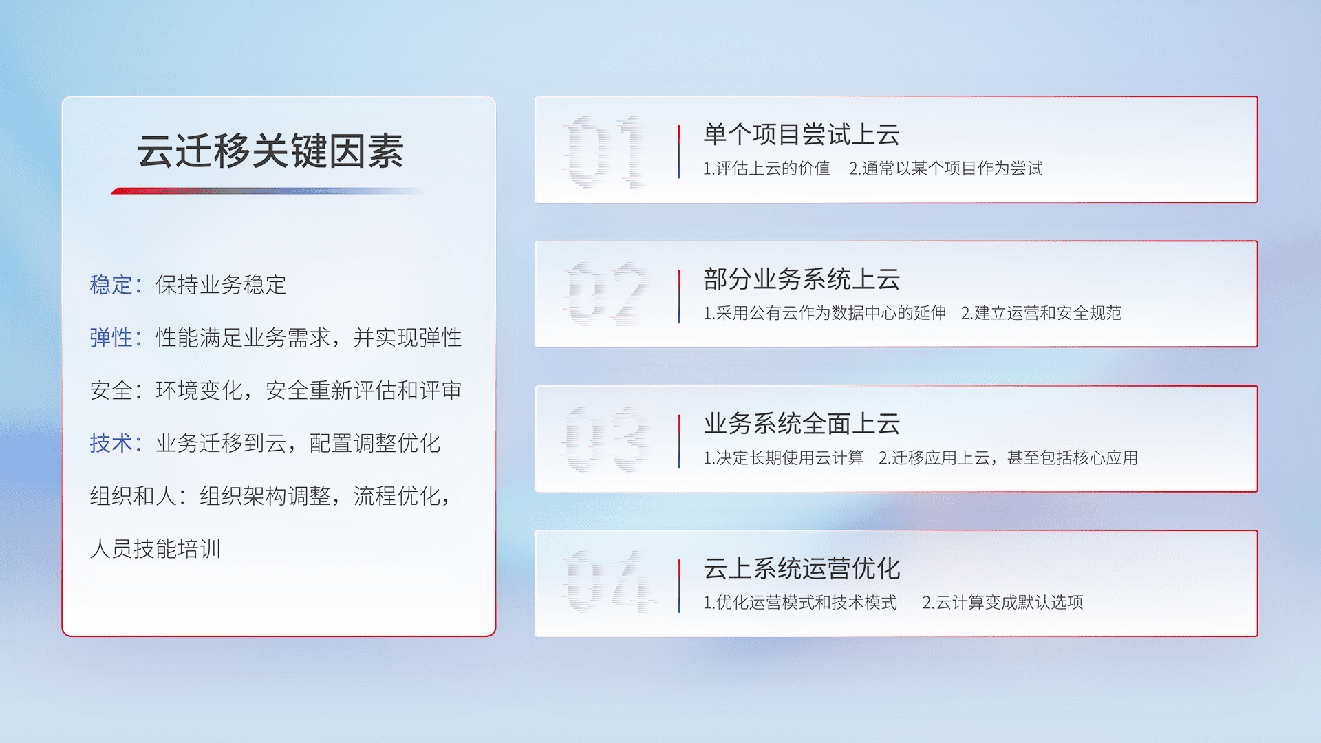 结合实际业务,,从规划设计、、、、云平台选型、、云原生改造、、、、数据迁移、、集成交付,,,,迁移全过程为客户识别最佳上云路径,,,,做好风险识别管理,,,设计网络架构、、身份权限、、安全审计合规、、操作审计、、日志审计、、监控告警策略、、、、多站点容灾设计等,,,对云上基础设施进行整体规划,,,提升IT治理水平,,,以满足弹性、、、高可用、、、高性能的需求。。。。
