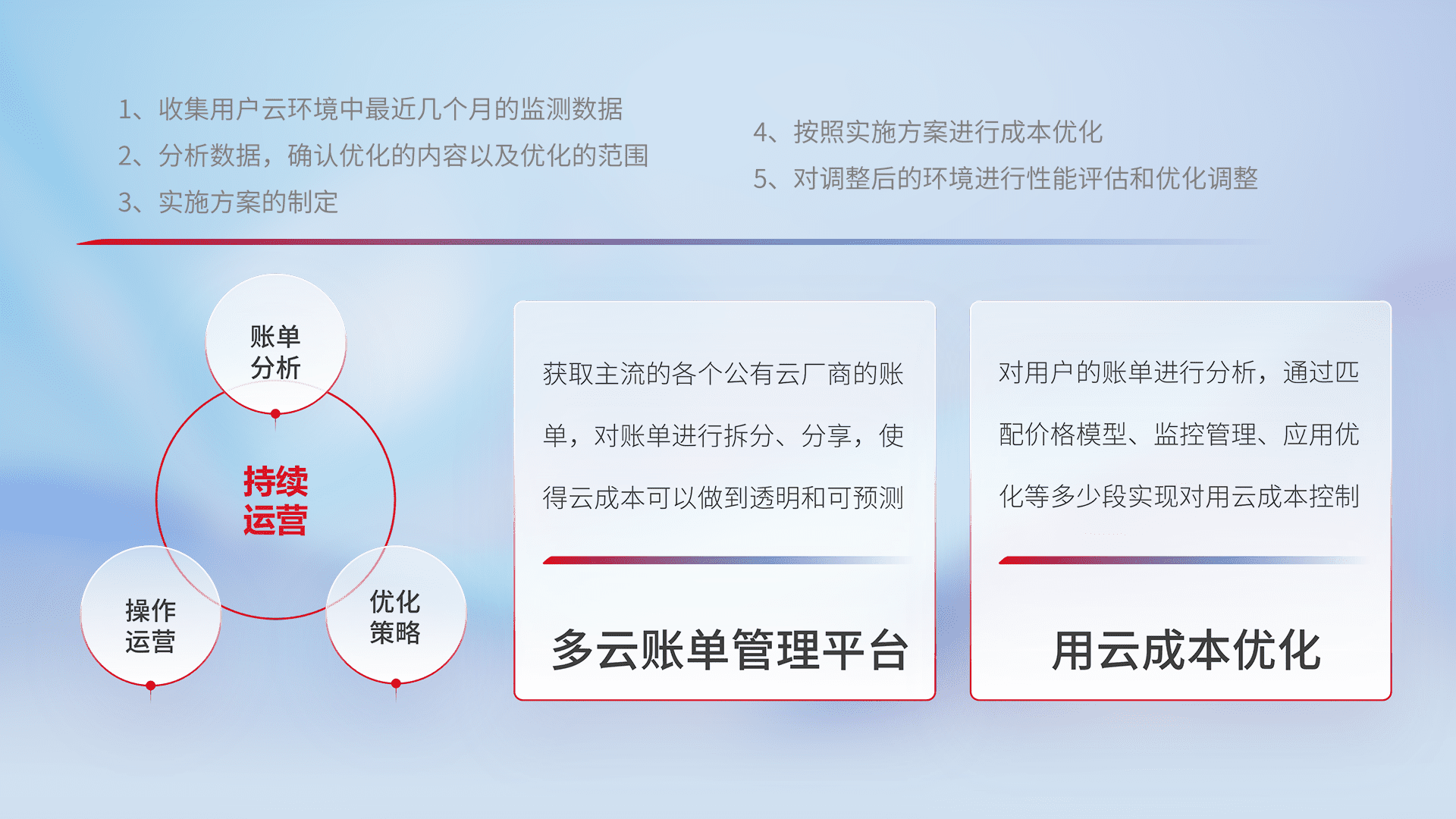 通过多云纳管,,以统一的资源数据模型把客户的云资源进行抽象和封装,,,,进而实现对多云资源的统一操作,,,,保障云资源管理的可靠性、、、稳定性与可用性。。。量身定制化运维内容,,,,配置、、、、开发运维、、、补丁管理、、、备份、、监控、、认证和访问管理、、审计和日常巡检等,,保障在用云过程中的可靠度,,,稳定度以及高可用率。。。。